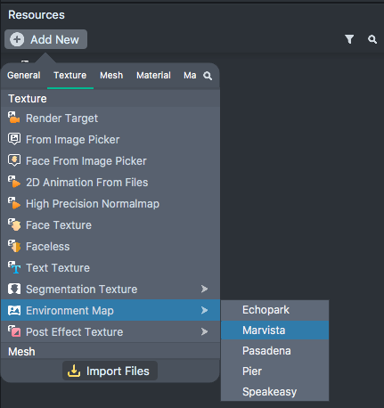 To import your own environment map, make sure it is an .hdr or .exr image in latitude/longitude (latlong) format. Simply drag the file to the resources tab in Lens Studio. Substance uses the same environment map formats, so you can import the same environment into Substance, and vice versa.