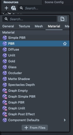 To use your PBR textures in Lens Studio, first import them to the project by dragging them into your Resources panel. Next, create a new PBR material by selecting + -> Material -> PBR in the Resources panel.