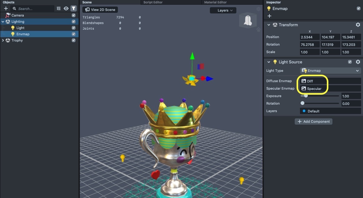 After import, two textures will be generated: a diffuse and a specular environment map. Select the Envmap light source and replace the textures with your newly generated diffuse and specular textures.