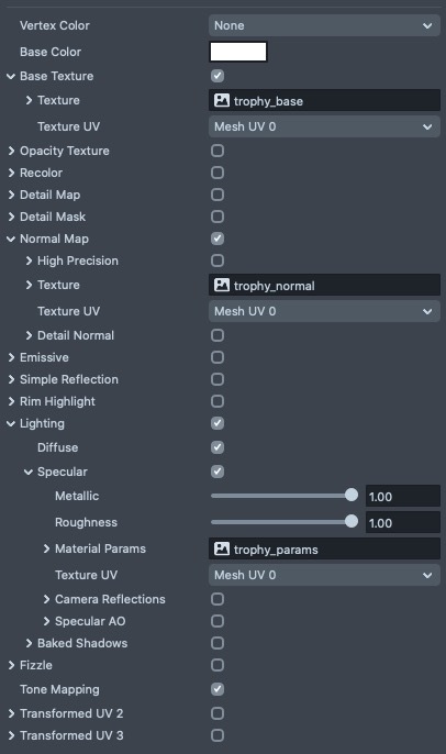 Material Params Textureis unique to our engine. It is a single texture that represents Metallic, Roughness and Ambient Occlusion in the red, green and blue color channels respectively.