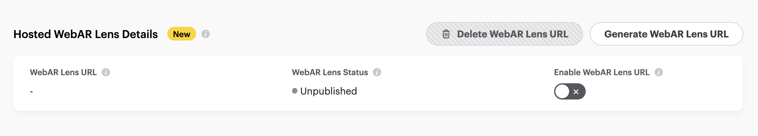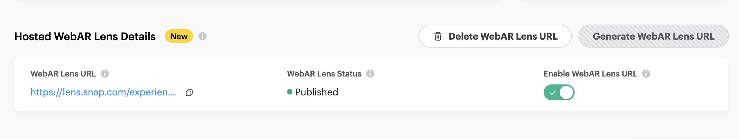 If you need to permanently delete the Hosted WebAR Lens URL, you can do so by clicking the Delete WebAR Lens URL button.