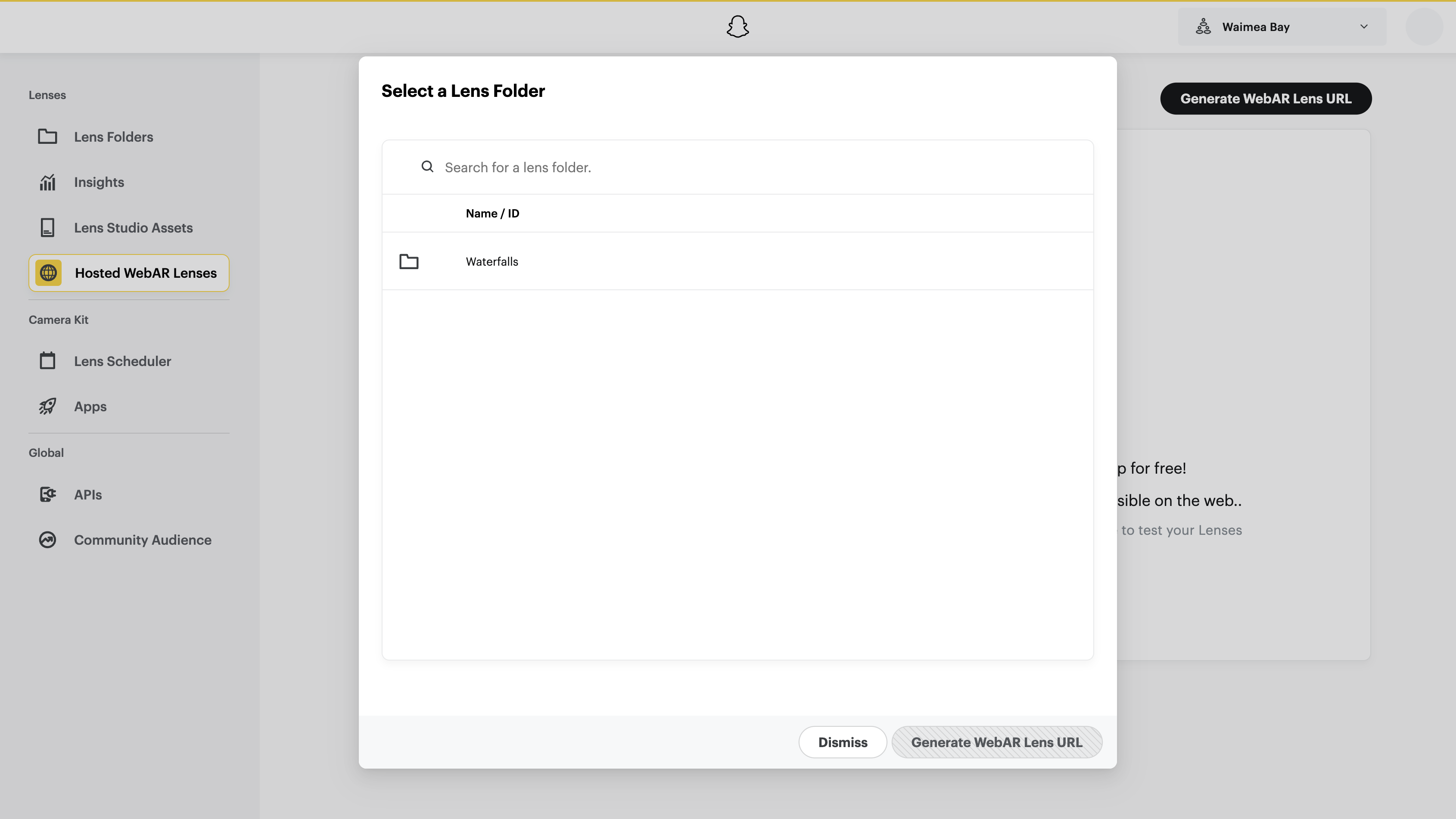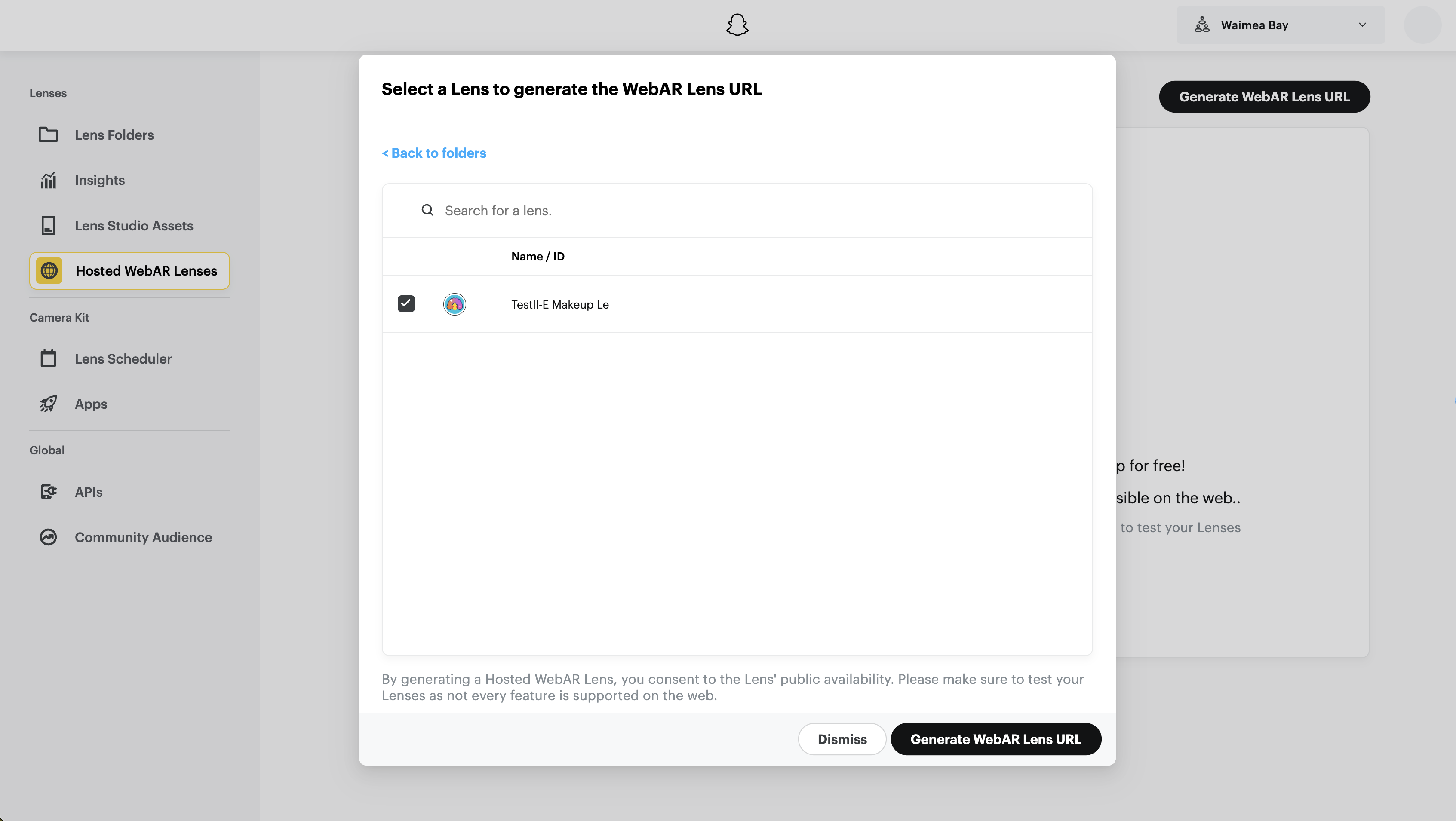 - Select the Lens you want to use as your Hosted WebAR Lens.