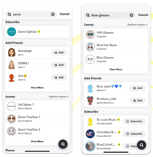 Search allows Snapchatters to find Profiles and Lenses. Results appear based on relevancy, match to the keywords searched, and popularity. Lenses can be searched by name, creator or search tag.