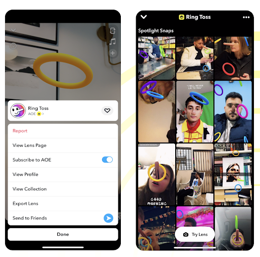 Snapchatters are more likely to engage with your Lens if they are able to see how it is used in the wild and understand how they can create their own content. When you navigate to the Lens Page from the Camera, you can see public Spotlight Snaps that utilize your Lens.