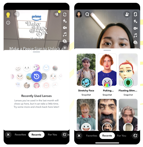 Snapchat introduced categories from the Lens Explorer directly to the Camera. “Recents” is a new category to help Snapchatters find and re-engage with Lenses they recently interacted with but maybe didn’t add to Favorites.