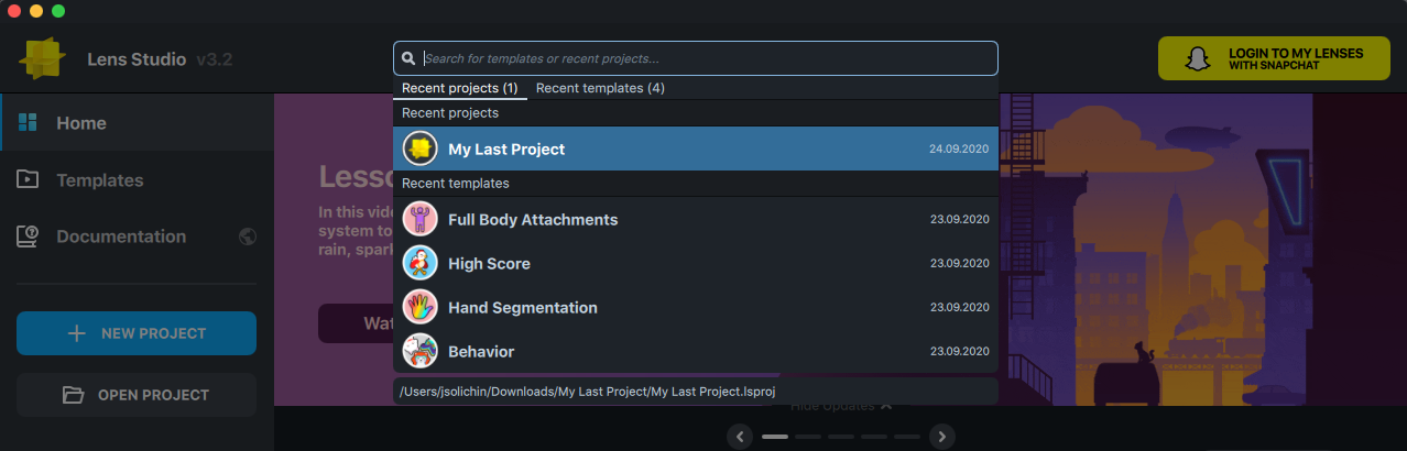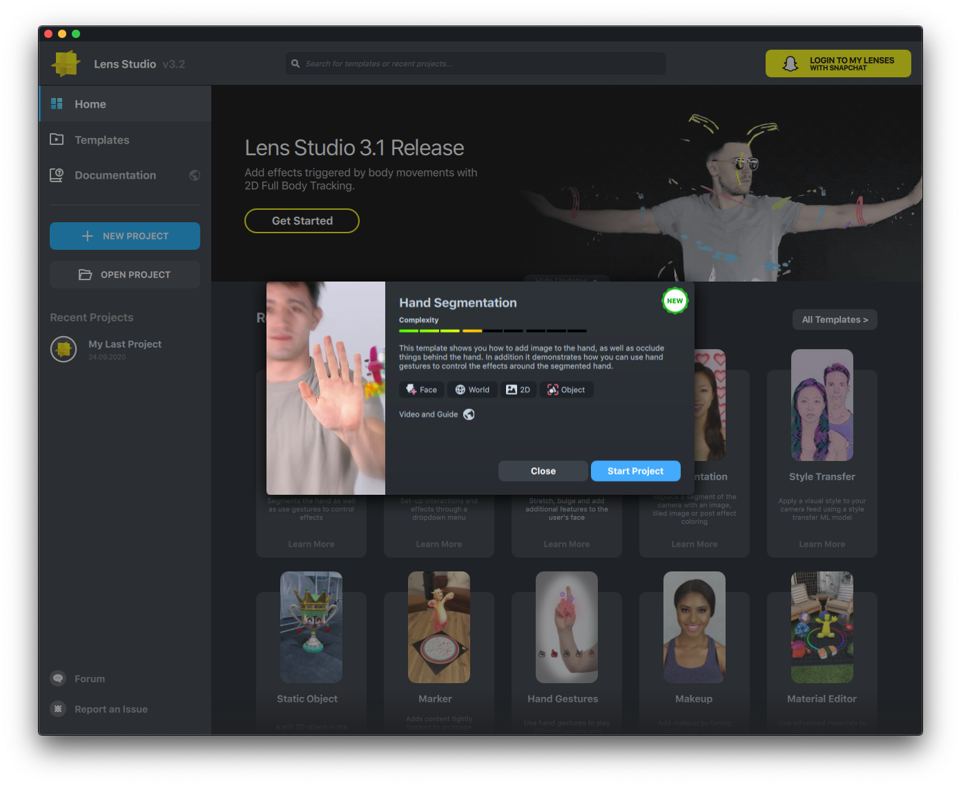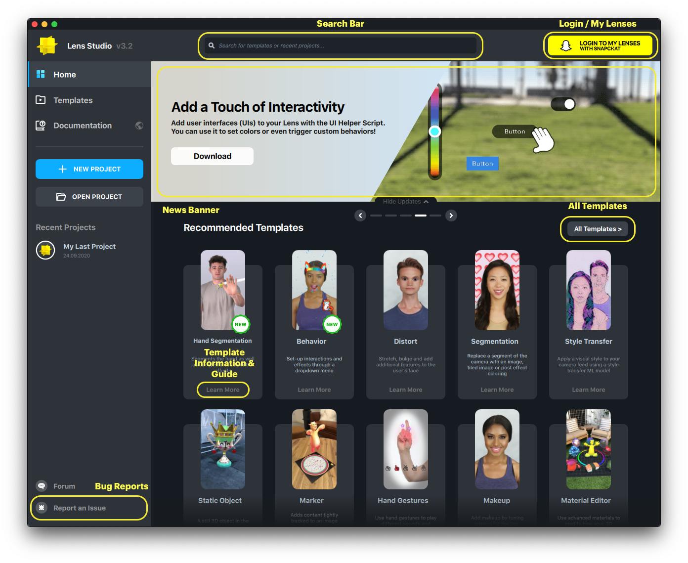 The Lens Studio home page provides you with a great starting point for starting, or continuing your next great Lens