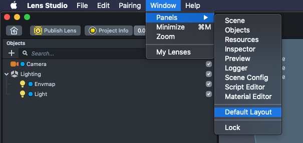 If you ever get lost in Lens Studio, you can click the home button to find what you were last working on, or to get inspired from. Alternatively, you can also click Window > Panels > Default Layout in the Lens Studio menu bar to reset your Project window.