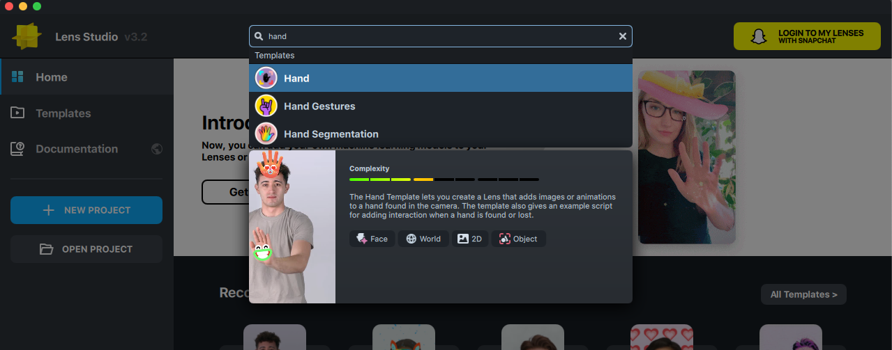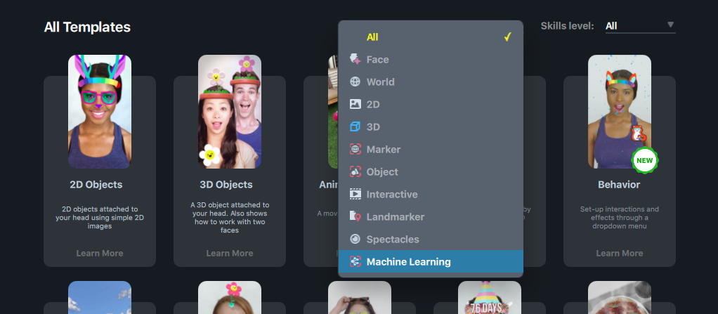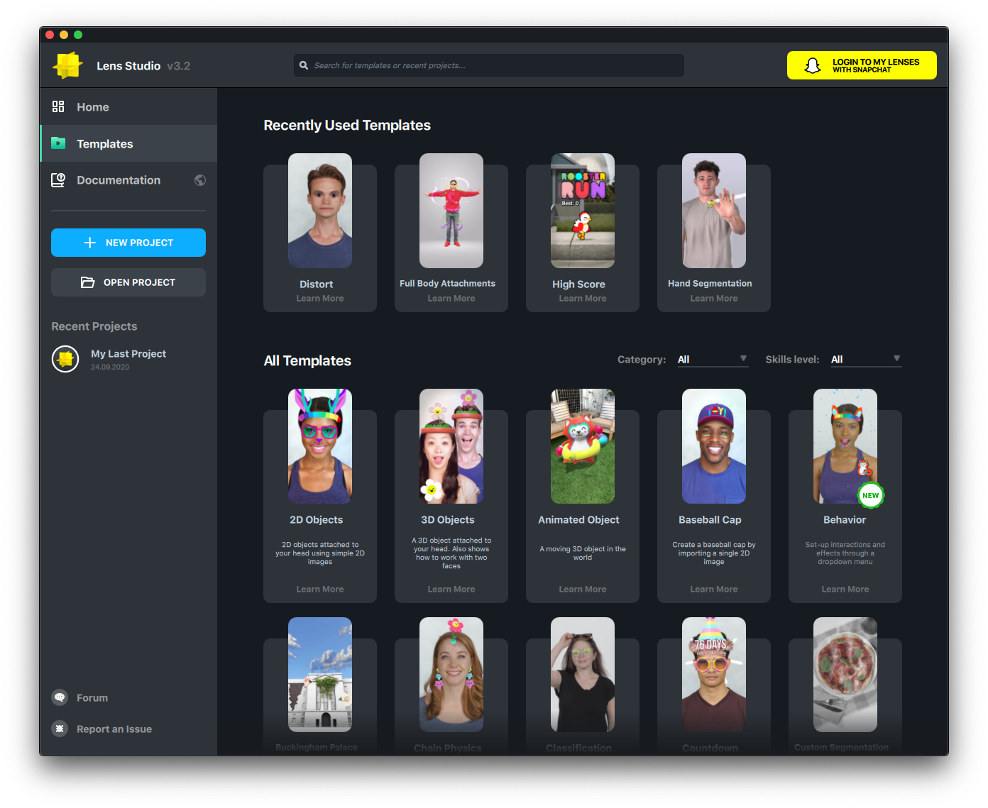 In addition to the featured templates, Lens Studio comes with many different templates for different goals, skill levels, or interests. Click the All Templates button on the right, or Templates in the sidebar to find them all.