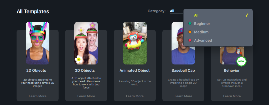 Templates are a great way to explore new Lens Studio features, as well as kick off your next project. For every template, you can click the Learn Morebutton, which will provide you information about the template as a quick link to its guide where you can learn the ins and outs of the template.