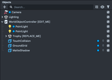 The Objects panel shows you the hierarchy of all objects in your scene. Objects can be parented and un-parented in the objects panel by dragging them up and down the hierarchy while holding the Left Mouse button down. For 2D effects like Screen Image and Post Effect, the Objects panel also controls the render order. The bottommost objects are rendered last making them appear in front of the topmost objects.