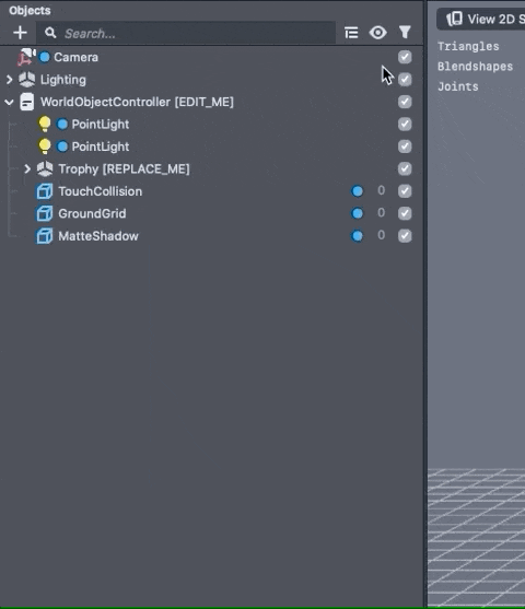 The View 2D Scene and View 3D Scene buttons toggle between the 3D scene and the 2D scene of your Lens project. The 2D scene mode is primarily used for visualizing and editing 2D objects like Screen ImagePost Effect and Face Effects. By default, selecting an object in the Objects panel will automatically select the best scene mode for that object. This can be disabled in the Lens Studio preferences by unchecking Auto Switch 2D / 3D Scene Panel.