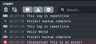 At the top of the Logger panel, there are several options which you can use to help you find the log lines you are looking for.