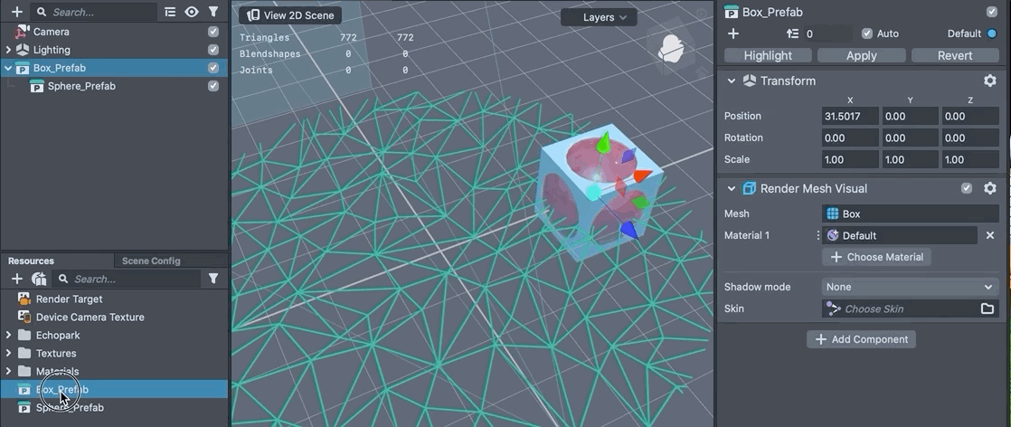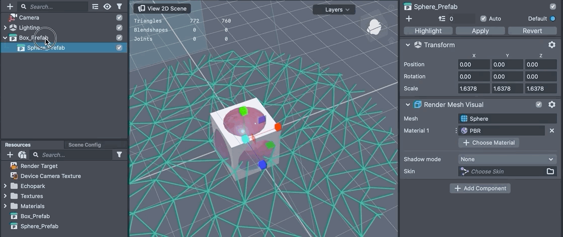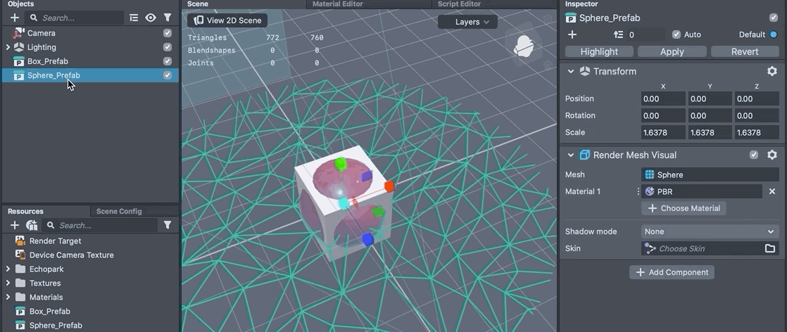 Prefab resources can be exported and shared across different Lens Studio projects, like any other Resource.