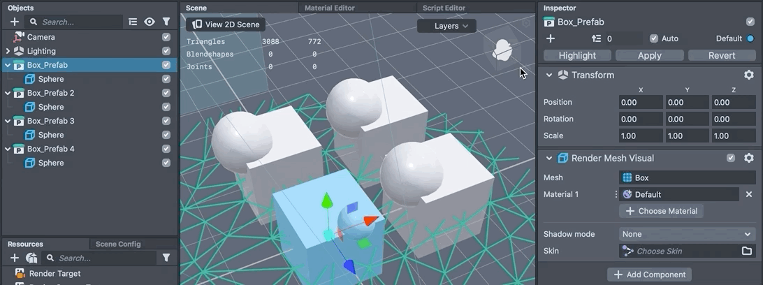 3. The Prefab resource should now be in your Resources panel. To add it to your scene, you can drag it from the Resources panel to the Objects panel