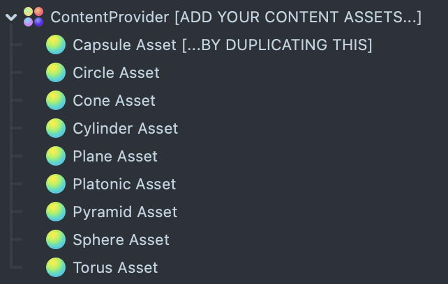 You can add your own assets for a Content Provider by adding a Content Provider Option component on SceneObjects that are parented a Content Provider SceneObject