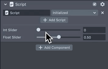 Draws a draggable slider that interpolates between two values. This works with int and float properties.