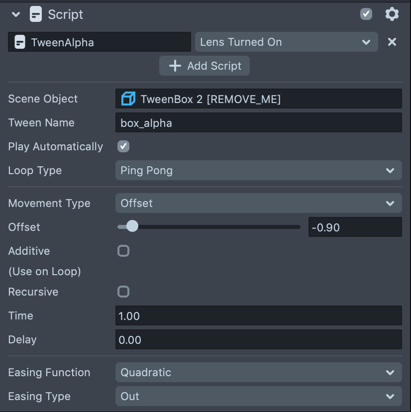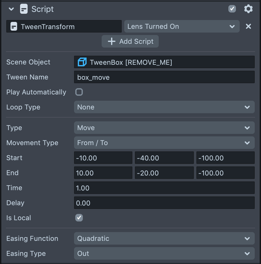 Tweens are added to Scene Objects as Script Components. These scripts, referred to as TweenTypes, each tween a different set of properties. You can learn more about the different TweenTypes in the next section.