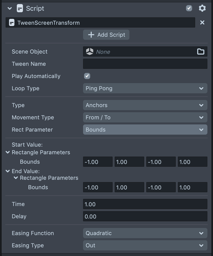 Add Scriptand select one of theTweenTypescripts in theTween -> TweenTypesfolder. - The script should be bound to the