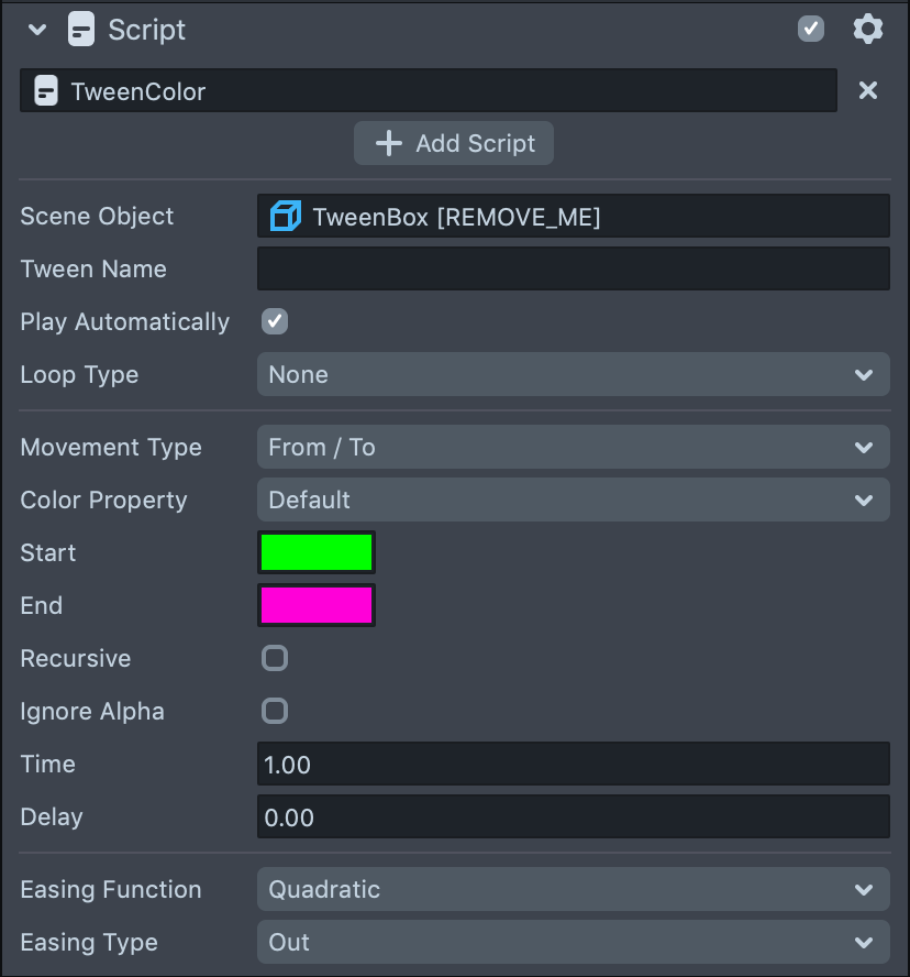 - Offset: A vec4 that represents the offset from the tween's start value (only available if Offset is chosen as the Movement Type)