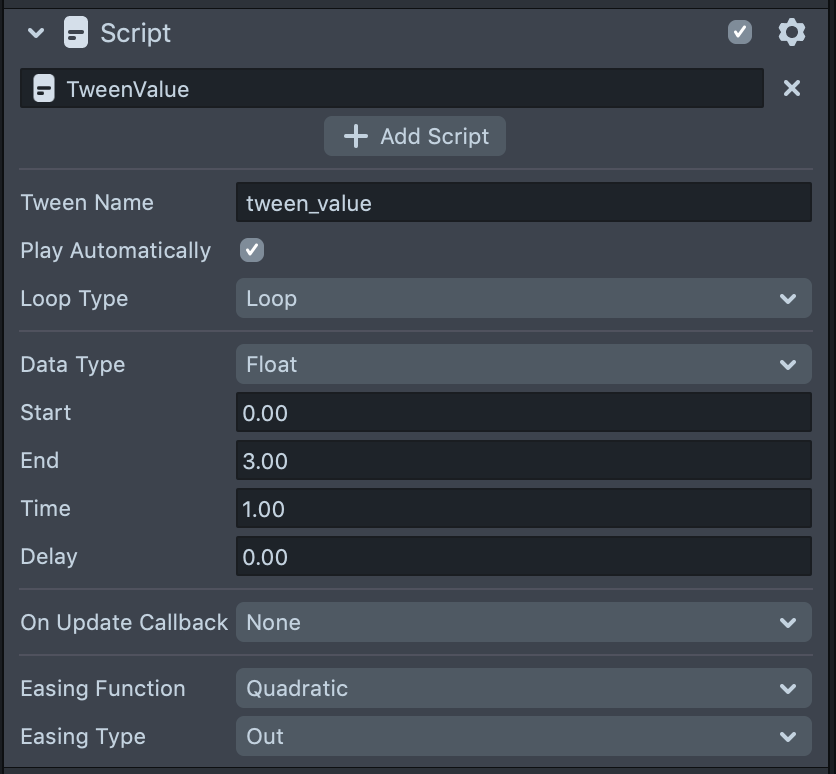 - Data Type: The data type of the value to be tweened (i.e. int, float, vec2, vec3, vec4)