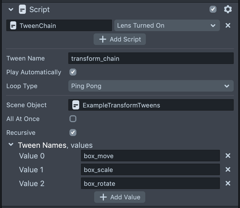 TweenTypescript components to be used in thisTweenChain. This field allows you to separate your base tweens from the object itself. If this field is left empty, theTweenChainwill useTweenTypescript components attached to the object that the script component has been added to - All At Once: If enabled, all specified