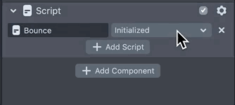 Using the Script component's event dropdown, Set the Bounce script's event to Frame Updated.