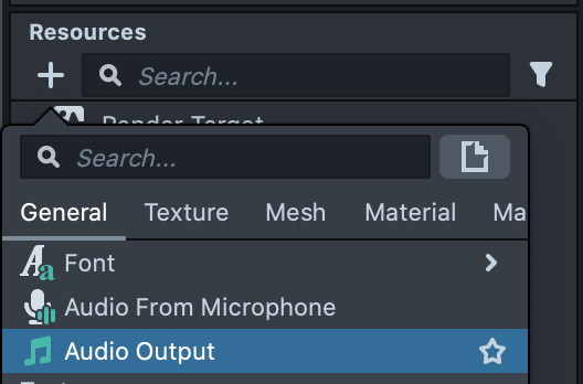 Audio Output audio track can be added by pressing the “+” button on the Resources panel and selecting Audio Output.