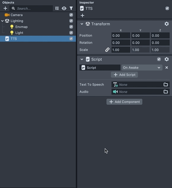 Attach Text To Speech Module and Audio Component to the script to connect them to the Script we wrote.
