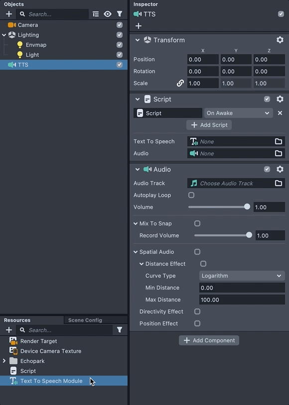 The main asset used for Text To Speech is Text To Speech Module. We can find it in the Resources panel. To add it into your Lens, in the Resources panel choose + -> Text To Speech Module.