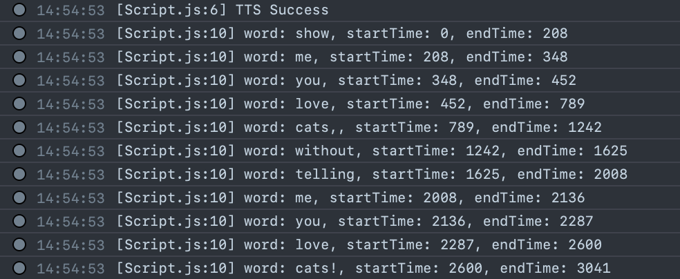 In addition to the TTS Audio Track Asset, we can also get word infos for timing details for how the words are pronounced by the synthesized voice.
