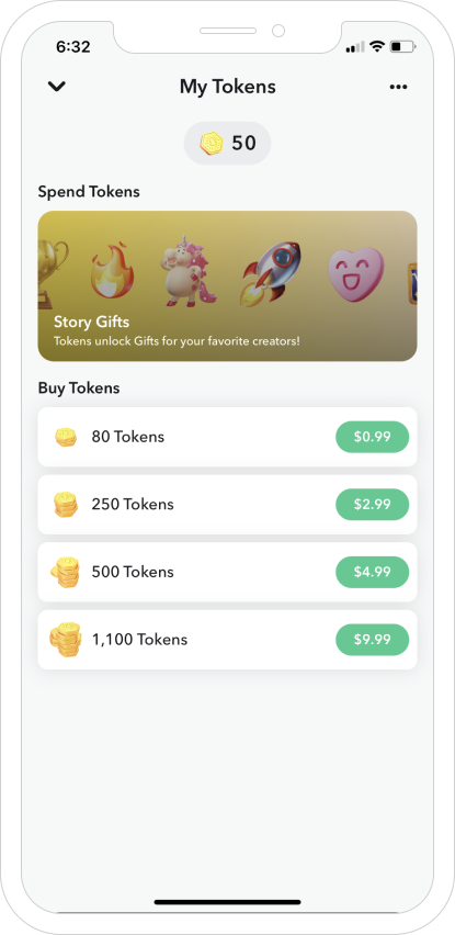 Snap Tokens can be purchased from inside the Snapchat app. In addition to Digital Goods in a Lens, Tokens can be used for Bitomji fashion drops and gifts to send to Snap Stars.