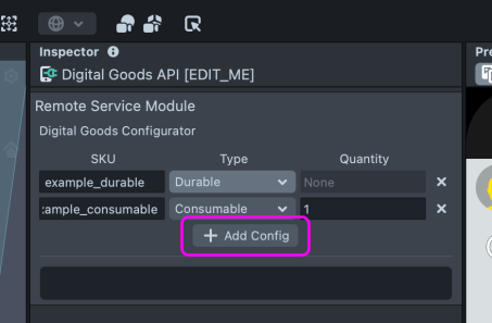 The Digital Goods API remote service module provides the Digital Goods Configurator, which is where you register digital goods to your Lens. To access the Digital Goods Configurator, click on Digital Goods API [EDIT_ME] in the Resources panel. The Digital Goods Configurator will appear in the Inspector panel.