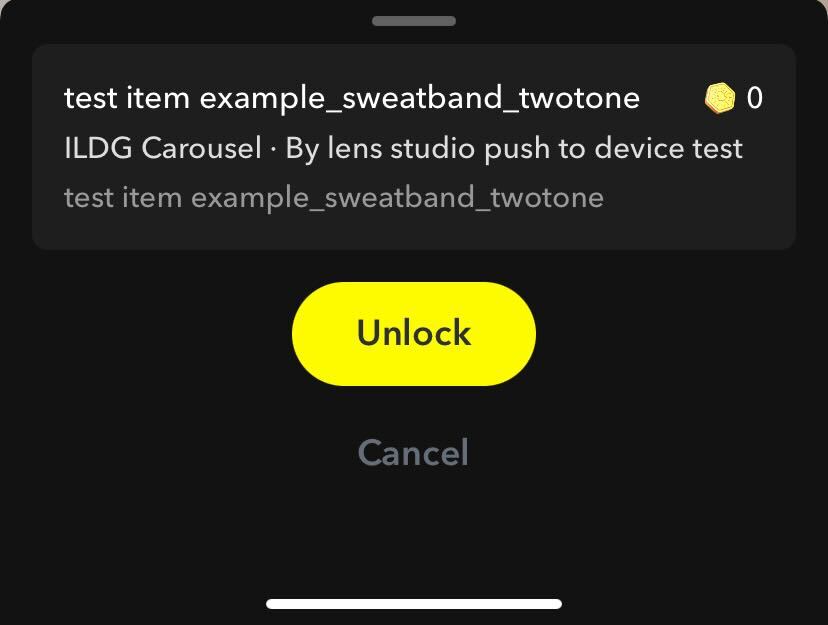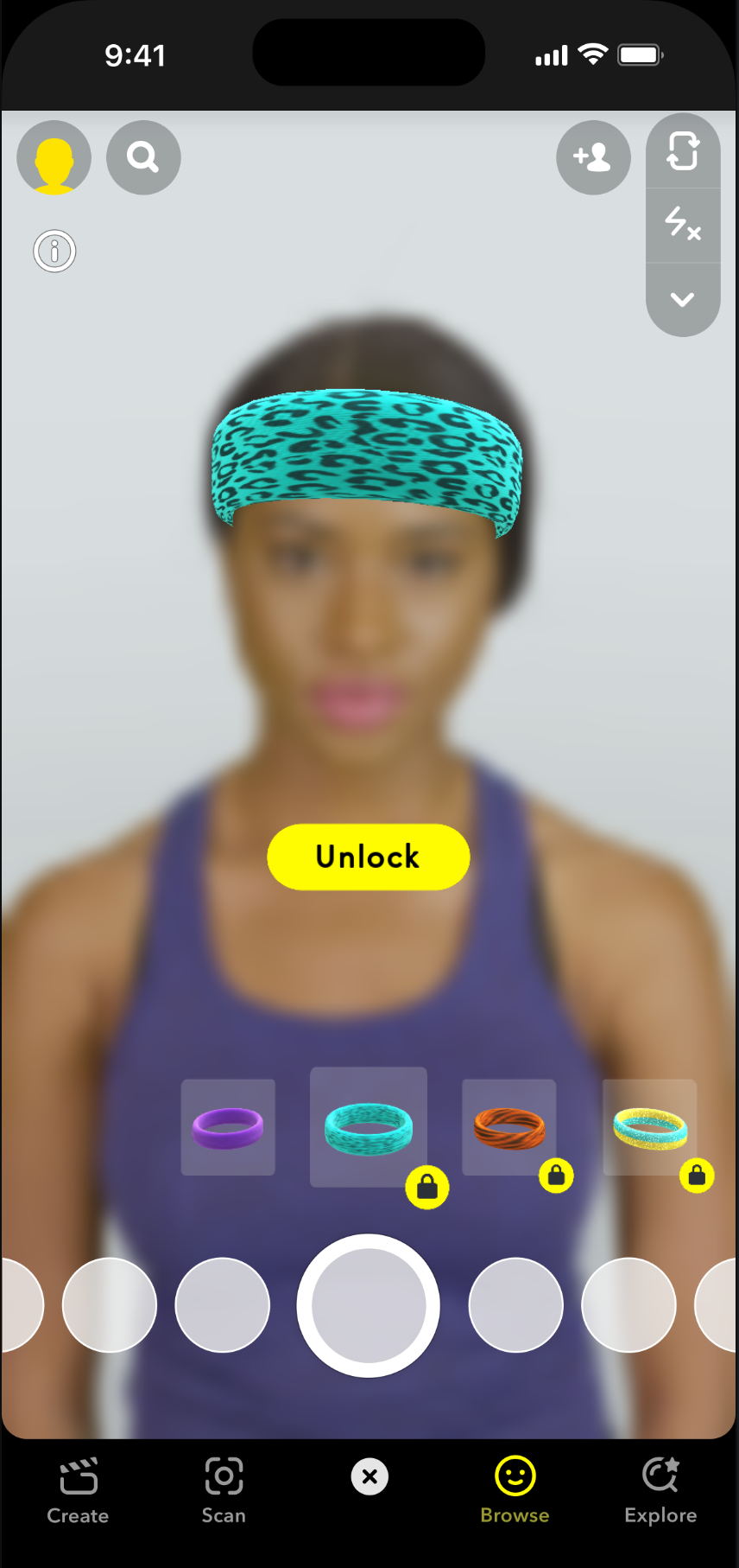 When a locked carousel item is in focus, an Unlock button is also present to trigger the purchase tray. Since the digital good in this example is wearable, the Snapchatter is blurred to protect the value of the locked digital good.