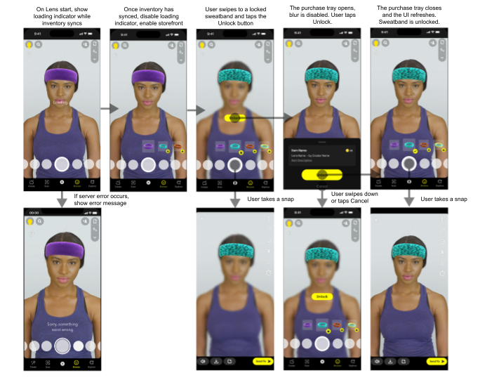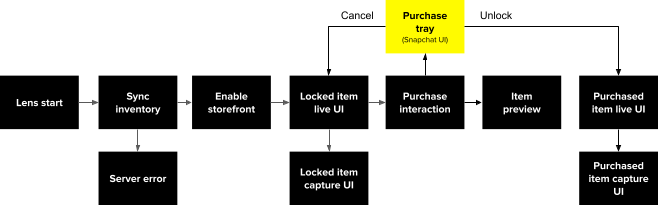The following chart outlines the basic user flow required for a Snapchatter to redeem Snap Tokens for digital goods in your Lens. States in black need to be designed by you, the Lens creator. States in yellow (i.e., the purchase tray) are handled by Snapchat.