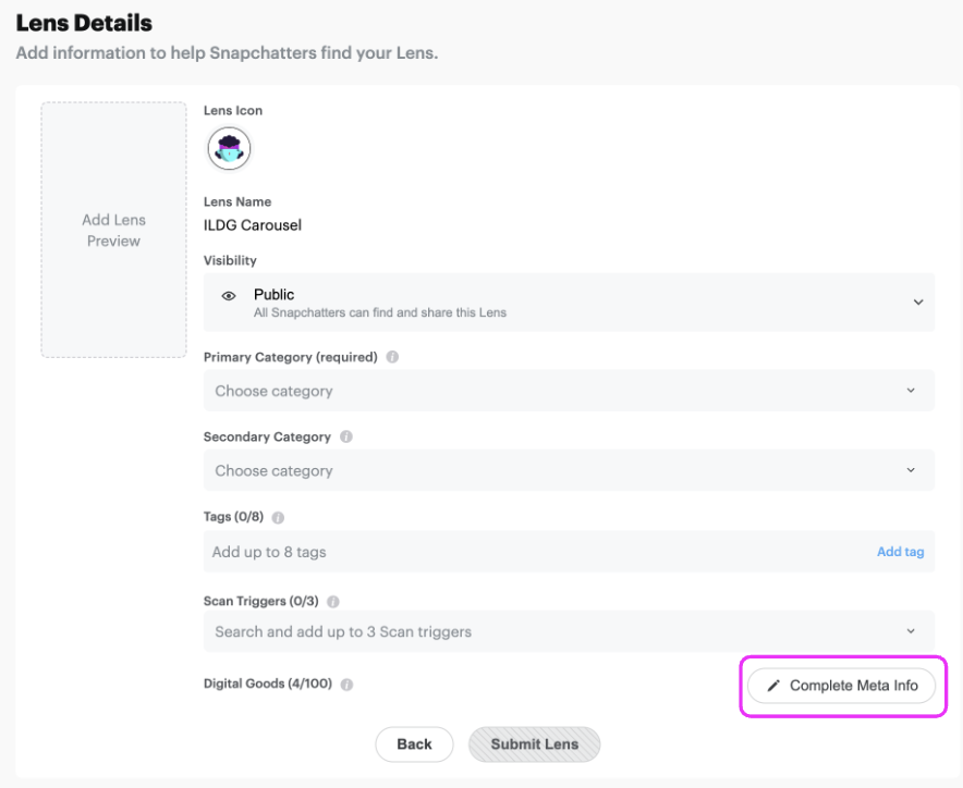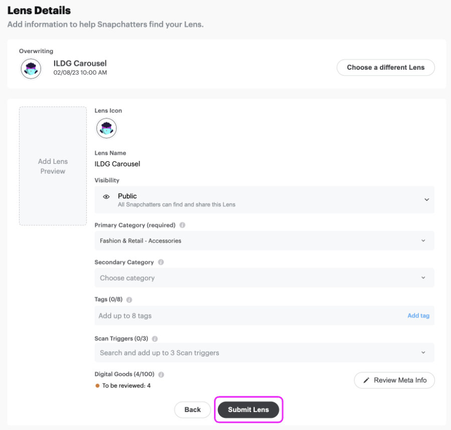 Once submitted, your Lens and digital goods will go through automated testing and moderation. In addition to Snap’s Submission Guidelines, Lenses with digital goods are subject to the Guidelines and Restrictions outlined in About In-Lens Digital Goods. Your Lens will be published upon successful review and receipt of your signed Snap In-Lens Digital Goods Terms.