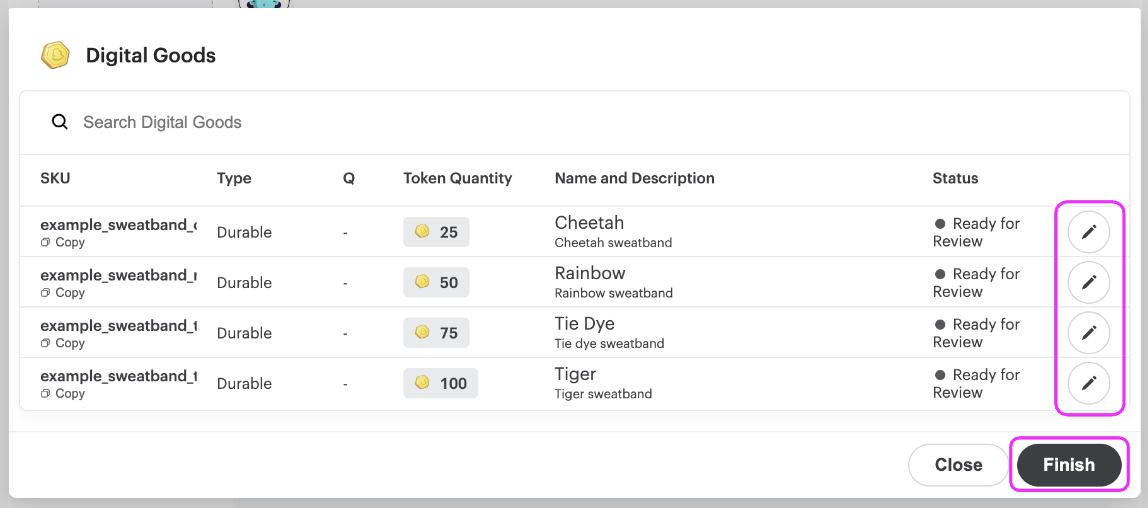 SKU and Type cannot be changed once your Lens is published. After publishing your Lens, you are permitted to add new digital goods to your Lens. For the new SKUs to take effect, you must republish your Lens.