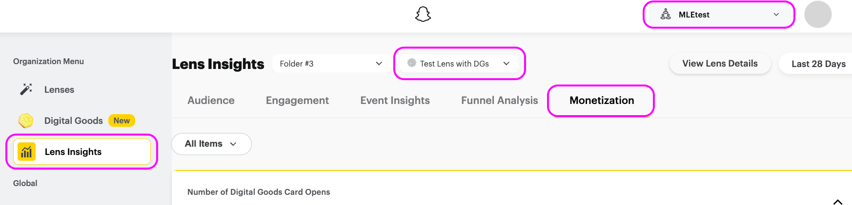 Digital goods analytics are available in My Lenses. To view your data, open Lens Insights and click on the Monetization tab. Select a Lens Folder from the top right drop-down menu, and a Lens from the top middle dropdown to view Lens-specific data.