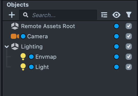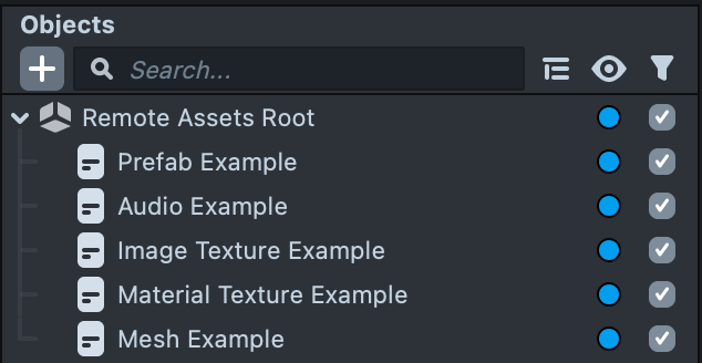- Add a scene object to the top of the Objects panel hierarchy. Name it Remote Assets Root.