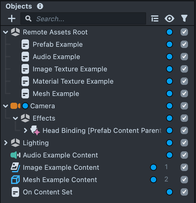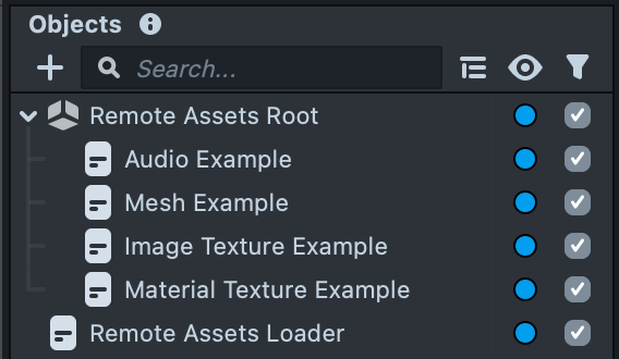 - Add these scripts to the Objects panel below the Remote Assets Root.