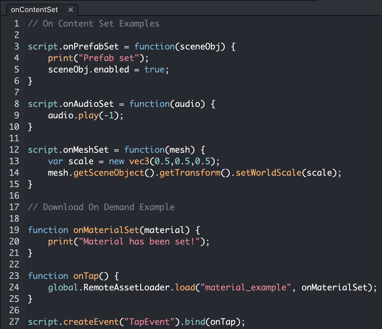- If applicable, write scripts to define onActionComplete( ) callback function behavior and / or to call global.RemoteAssetLoader.load( ). In the example screenshot, the script onContentSet.js provides callbacks for different Actions, e.g., onPrefabSet( ).