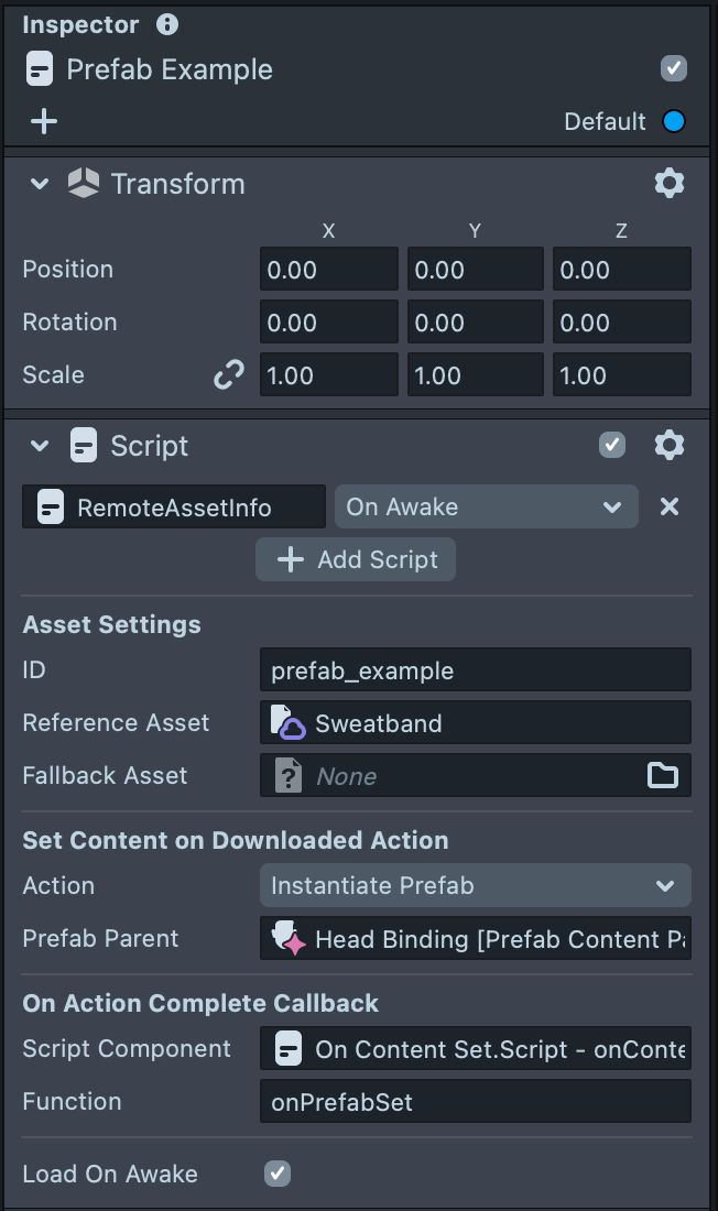 | Script Component | Component.ScriptComponent containing a callback function that executes when the remote asset downloads successfully and / or Lens content is set | Optional |