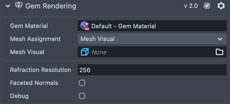 The Gem Rendering Custom Component is the main entrypoint for gem rendering. Here is where the material and meshes are assigned, as well as some quality and debugging controls.