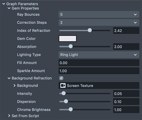 - Background Refraction: When enabled, sample the background to give the gem a feeling of transparency.