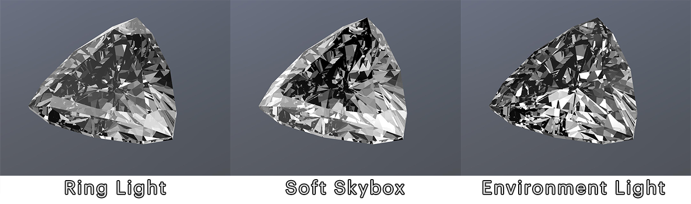 - Lighting Type: offers both Ring Light and Soft Skydome, both sample a neutral virtual environment dome that’s been designed to look good for many gem types. Environment Light samples the Envmap in the scene. See below for more lighting information and tips.