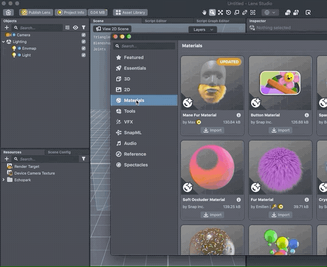 You can add a material from the material library by clicking the Asset Library button in the top left of Lens Studio.