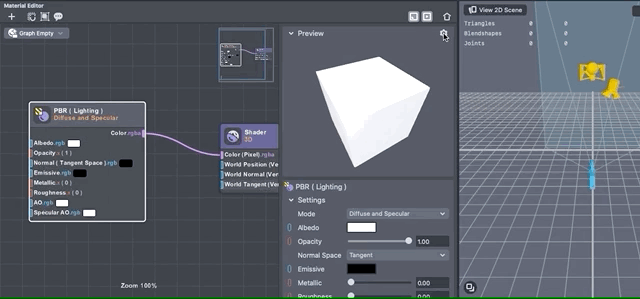 If you click on the PBR (Lighting) node, a preview window will show up on the right side of the Material Editor. If nothing is connected to the PBR (Lighting) node, you can adjust color and values under Settings. To connect textures input you can create materials with varieties of Opacity, Metallic, Roughness or AO levels across the mesh surface.