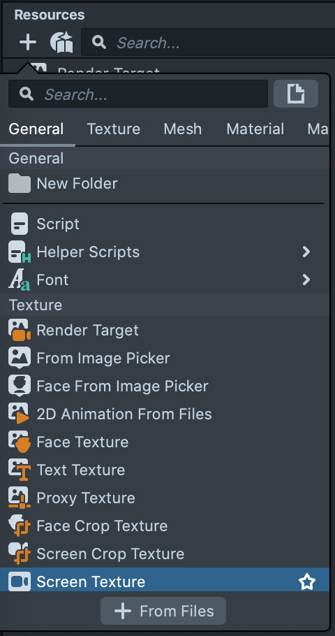 You can create Screen Texture by searching it in Resources panel -> + -> Screen Texture.