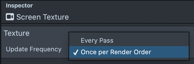 In the Inspector panel there are options available for Screen Texture Update Frequency: