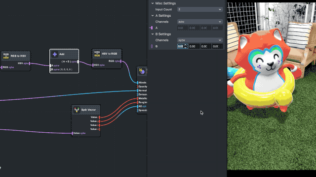 So let's change some colors. Drop an Add node between RGB to HSV and HSV to RGB. On the Add node's B channel, change it from Auto to xyzw. Now fiddle with the numbers- the first number will change the hue, the second number will change the saturation, and the third will change the value.