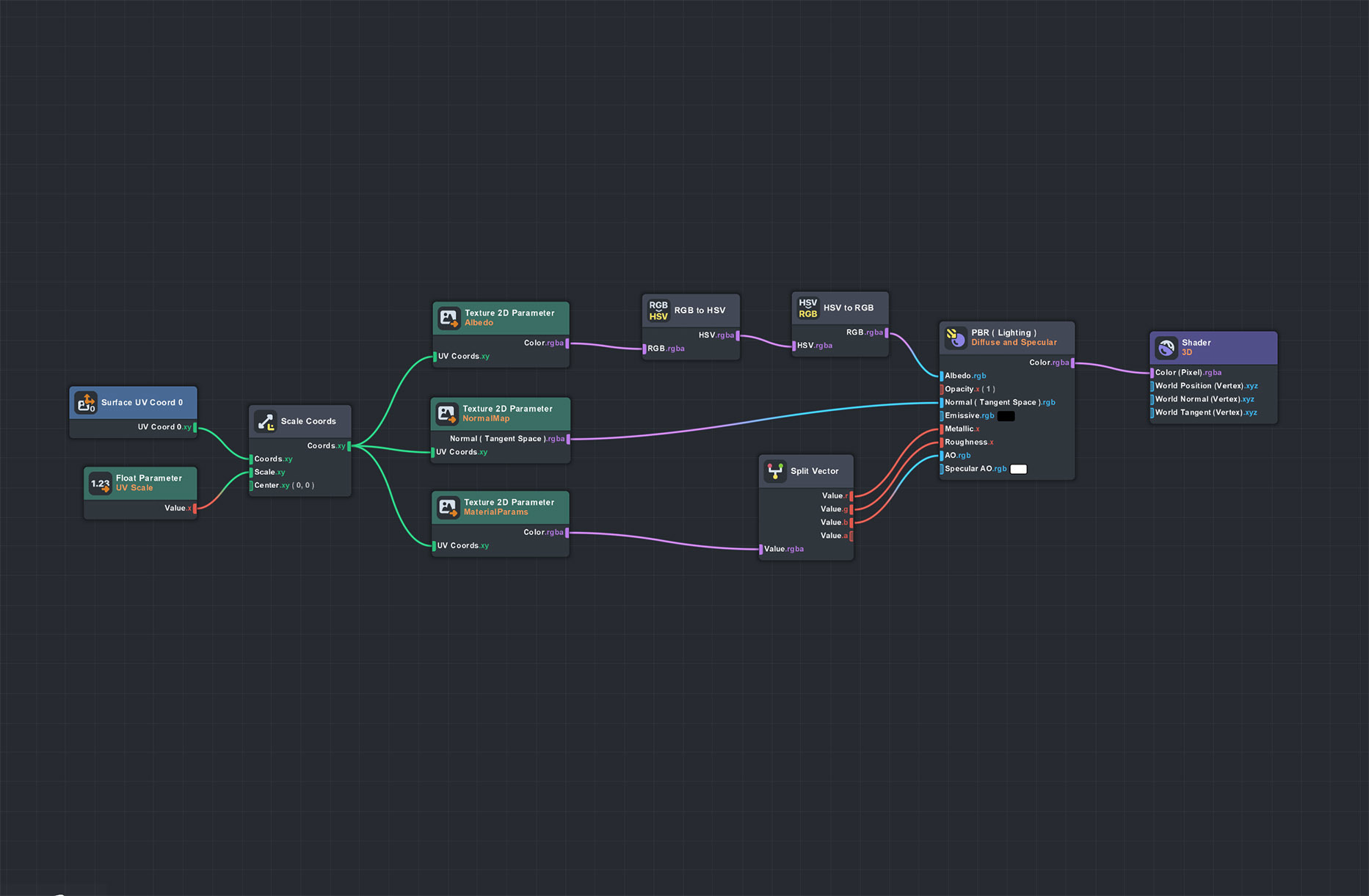 Next, we'll add an RGB to HSV node and a HSV to RGB node, and connect them in line between the Diffuse Map and the Albedo parameter of the PBR node. This won't have any visual effect yet- all we're doing is converting from RGB color space to HSV, then right back to RGB again.
